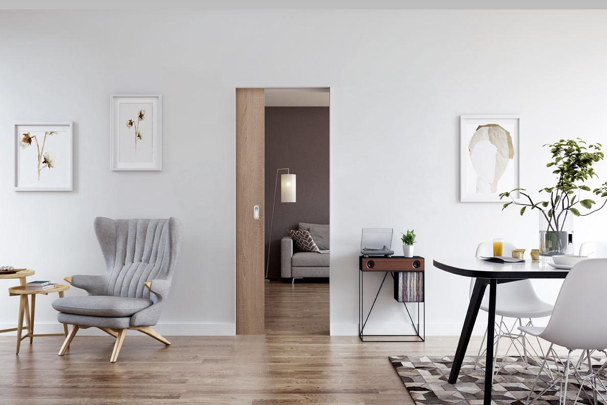 - Die Schiebetür läuft praktisch geräuschlos und leicht in der Wand. Sie lässt sich komplett unsichtbar in der Wandtasche versenken.
