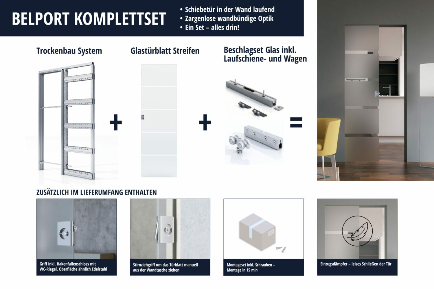 Mit dem BELPORT Komplettset bekommen Sie alle nötigen Komponenten die Sie benötigen. Wir übernehmen das zusammenstellen der optimalen Bestandteile für ein makelloses Zusammenspiel von System, Türblatt und komfortablem Zubehör. Sie müssen lediglich noch die Größe auswählen.