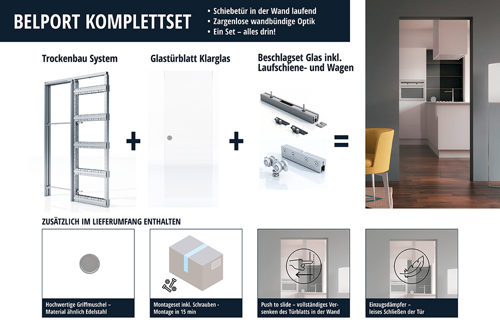 - Durch BELPORT werden Schiebetüren in der Wand mit einer zargenlosen Optik möglich. Insbesondere in modernen und designorientierten Räumen ist diese Schiebetür sehr beliebt.