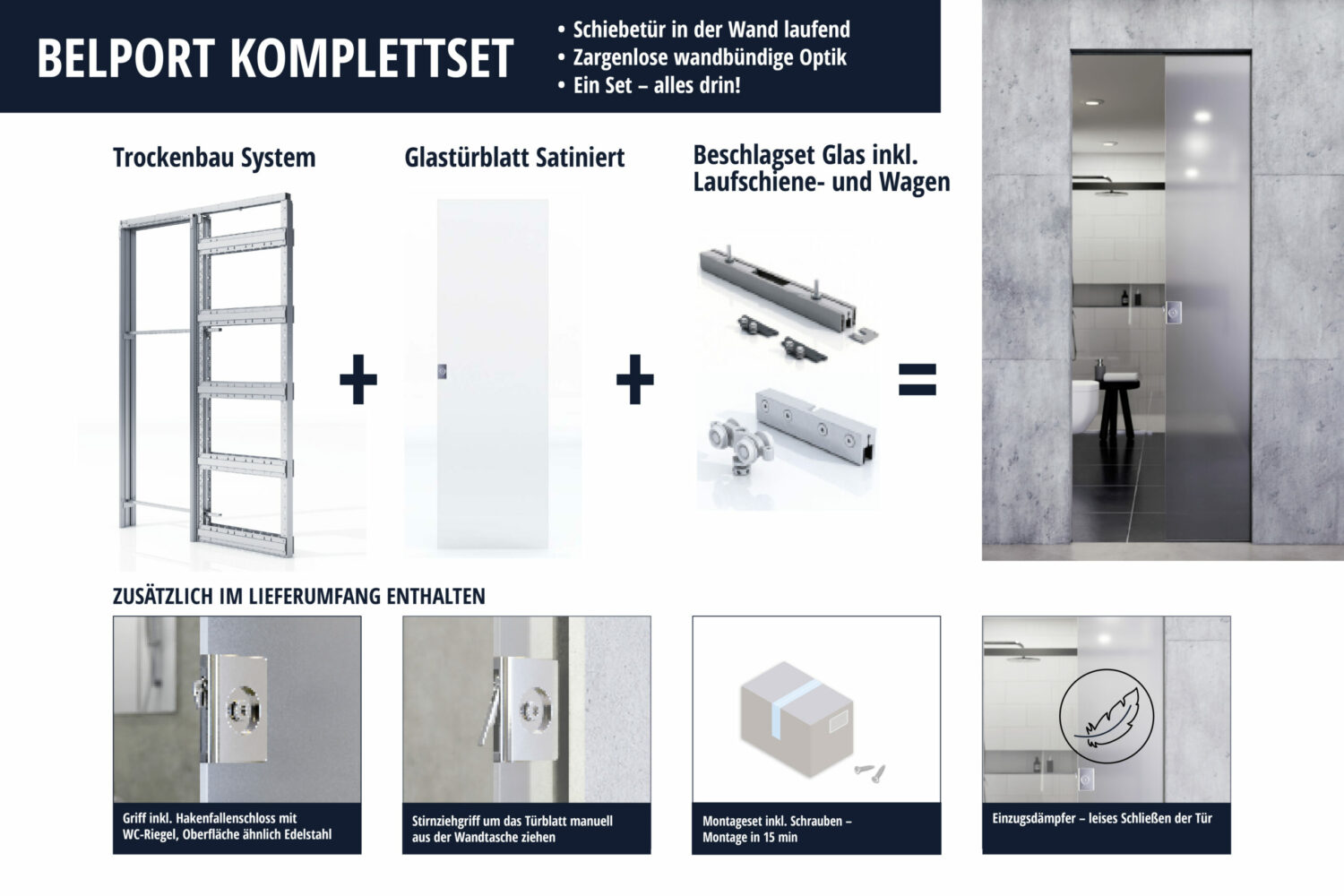 Mit dem BELPORT Komplettset bekommen Sie alle nötigen Komponenten die Sie benötigen. Wir übernehmen das zusammenstellen der optimalen Bestandteile für ein makelloses Zusammenspiel von System, Türblatt und komfortablem Zubehör. Sie müssen lediglich noch die Größe auswählen.