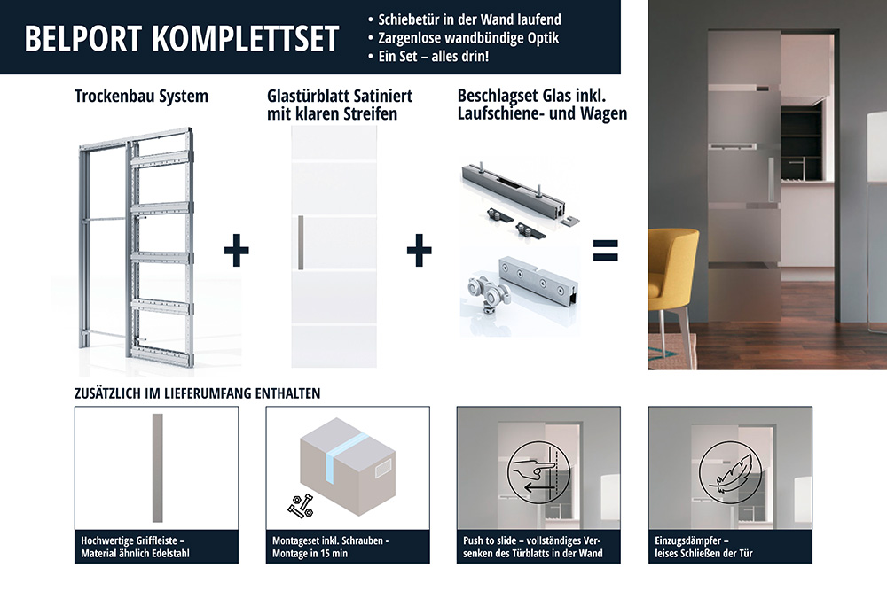 • Durch BELPORT werden Schiebetüren in der Wand mit einer zargenlosen Optik möglich. Insbesondere in modernen und designorientierten Räumen ist diese Schiebetür sehr beliebt.