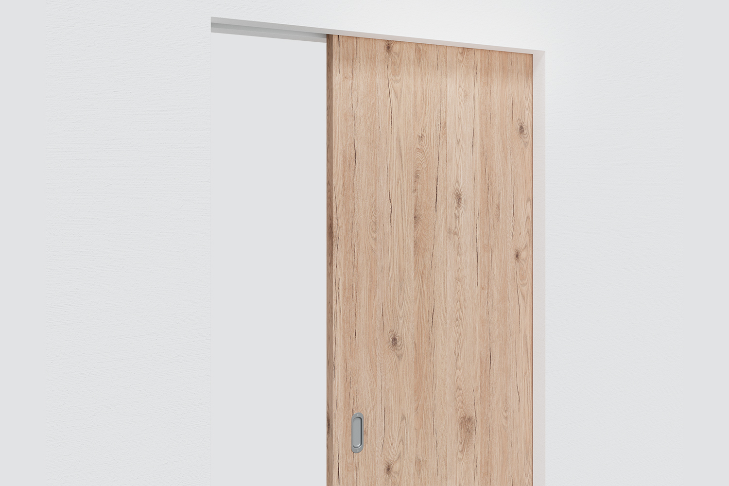 • Einflügeliges Schiebetürsystem in der Wand laufend
