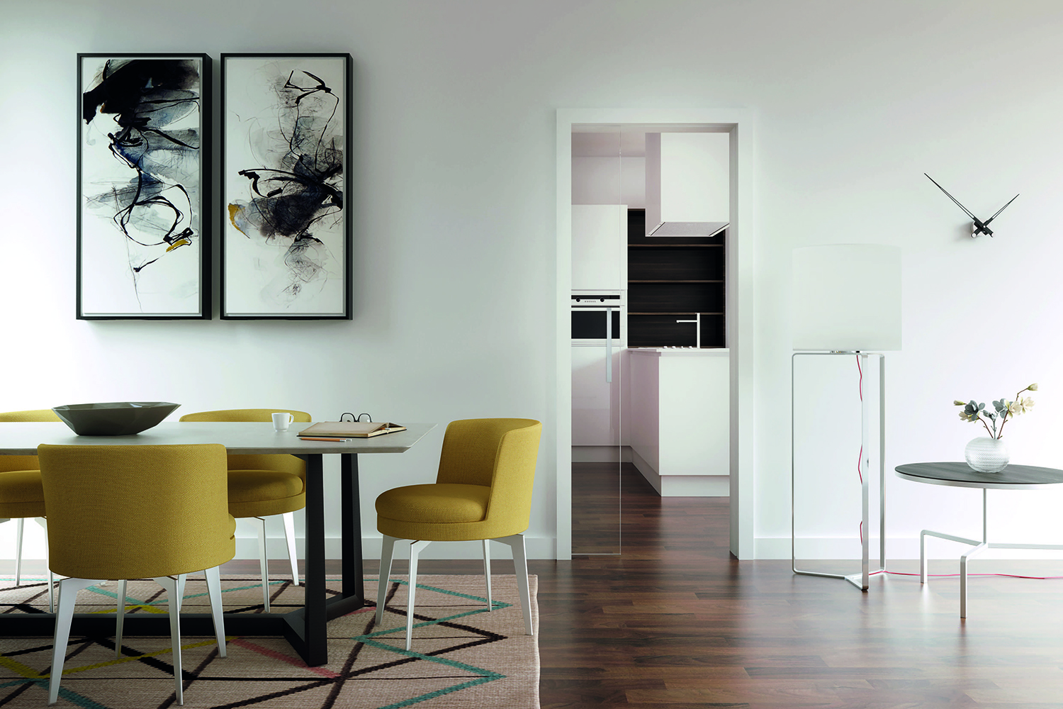 Die Ausstattungslinie Exklusiv ergänzt die Basis-Ausstattung um die Funktionalität Push to slide, kombiniert mit einem einseitigen Dämpfer, der das Türblatt beim Schließen entschleunigt und in seine Ruheposition zieht. Beide Zubehöre sind in der Laufschiene vormontiert. Die Funktion Push to slide gibt Türblätter wieder frei, die flächenbündig mit der Zarge in der Wandtasche ruhen. Durch sanften Druck auf die Wange des Türblattes springt dieses einige Zentimeter aus der Wandtasche hervor, sodass der Griff des Türblattes wieder betätigt werden kann. Die Ausstattungslinie Exklusiv unterstützt die detailreduzierte Optik von Schiebetüren optimal. Die Tür ist nur in geschlossenem Zustand sichtbar, wenn sie ihrer Funktion nachkommt und Räume voneinander trennt. Im geöffneten Zustand erlaubt sie es, die gesamte Durchgangsbreite zu nutzen.