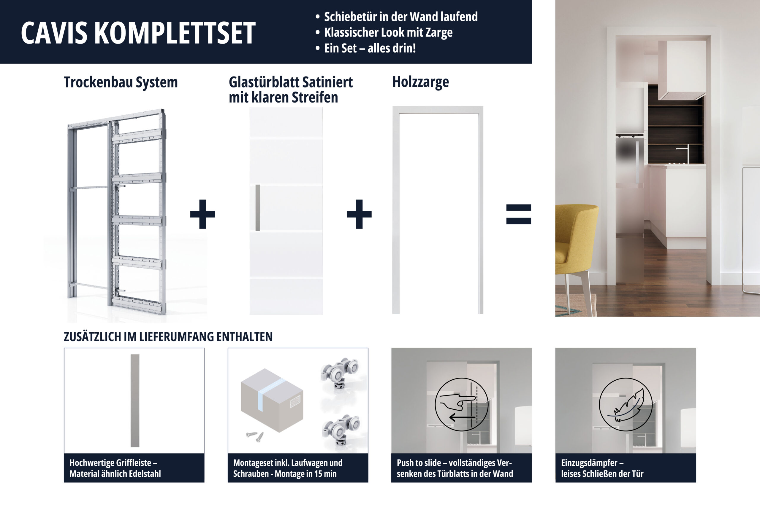 Mit dem CAVIS Komplettset bekommen Sie alle nötigen Komponenten die Sie benötigen. Wir übernehmen das zusammenstellen der optimalen Bestandteile für ein makelloses Zusammenspiel von System, Türblatt und komfortablem Zubehör. Sie müssen lediglich noch die Größe auswählen.